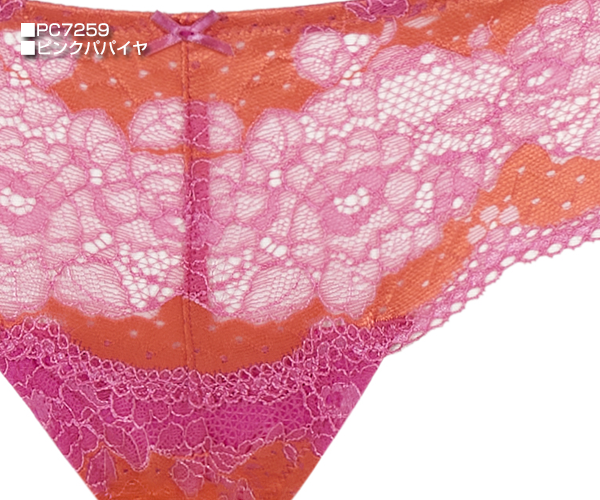 【お取り寄せ】■商品番号:PC7259PPY■本体価格4,180円■セクシーなT字バックスタイル。ウエスト部分はぐるっと一周レースをあしらったデザイン。T字部分はメッシュ地、クロッチ部分はコットンを裏打ち。
